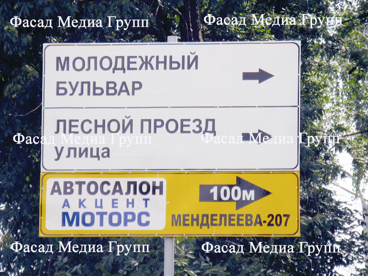 В условиях городской среды размещение информации о компании на дорожных указателях является эффективным средством продвижения бренда организации, поддержания внимания к вашему бизнесу, привлечения новых клиентов и удержания старых покупателей и заказчиков. Именно дорожные указатели, установленные на улицах города, помогают горожанам найти вас и купить необходимые товары или заказать услуги. Для размещения рекламы на дорожных знаках обращайтесь в рекламное агентство «Фасад Медиа Групп». Будем рады сотрудничеству.