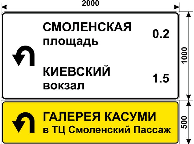 Место для информационных знаков или дорожных указателей выбирают в начале отрезка пути, на котором расположен объект инфраструктуры. Такие знаки устанавливаются, как правило, за 100 – 200 м. до рекламируемого объекта инфраструктуры. Итак, дорожные знаки в рекламных целях разрешено устанавливать: