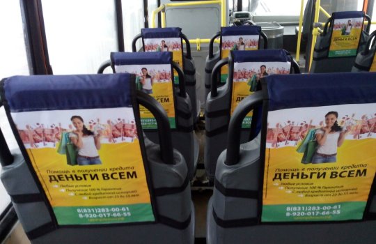 Реклама на подголовниках в транспорте на фото выше
