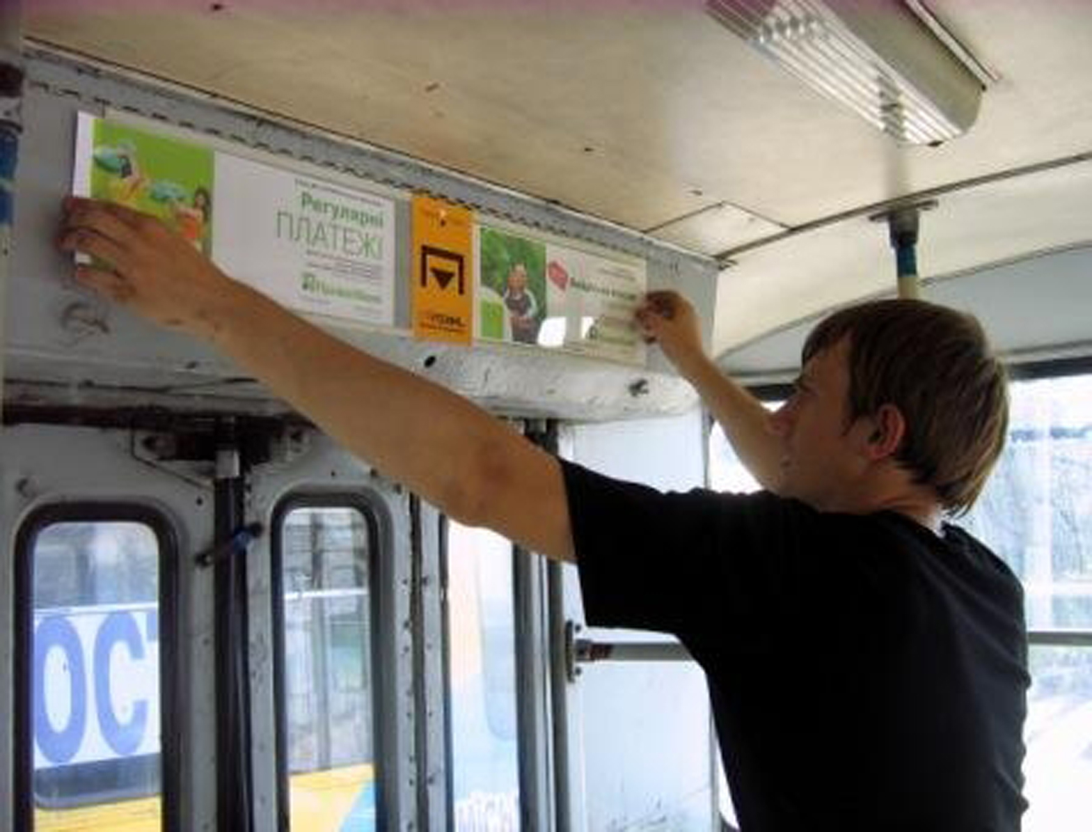 Монтаж рекламы в автобусах осуществляется по-разному в зависимости от того, какой рекламный материал и где размещается.
