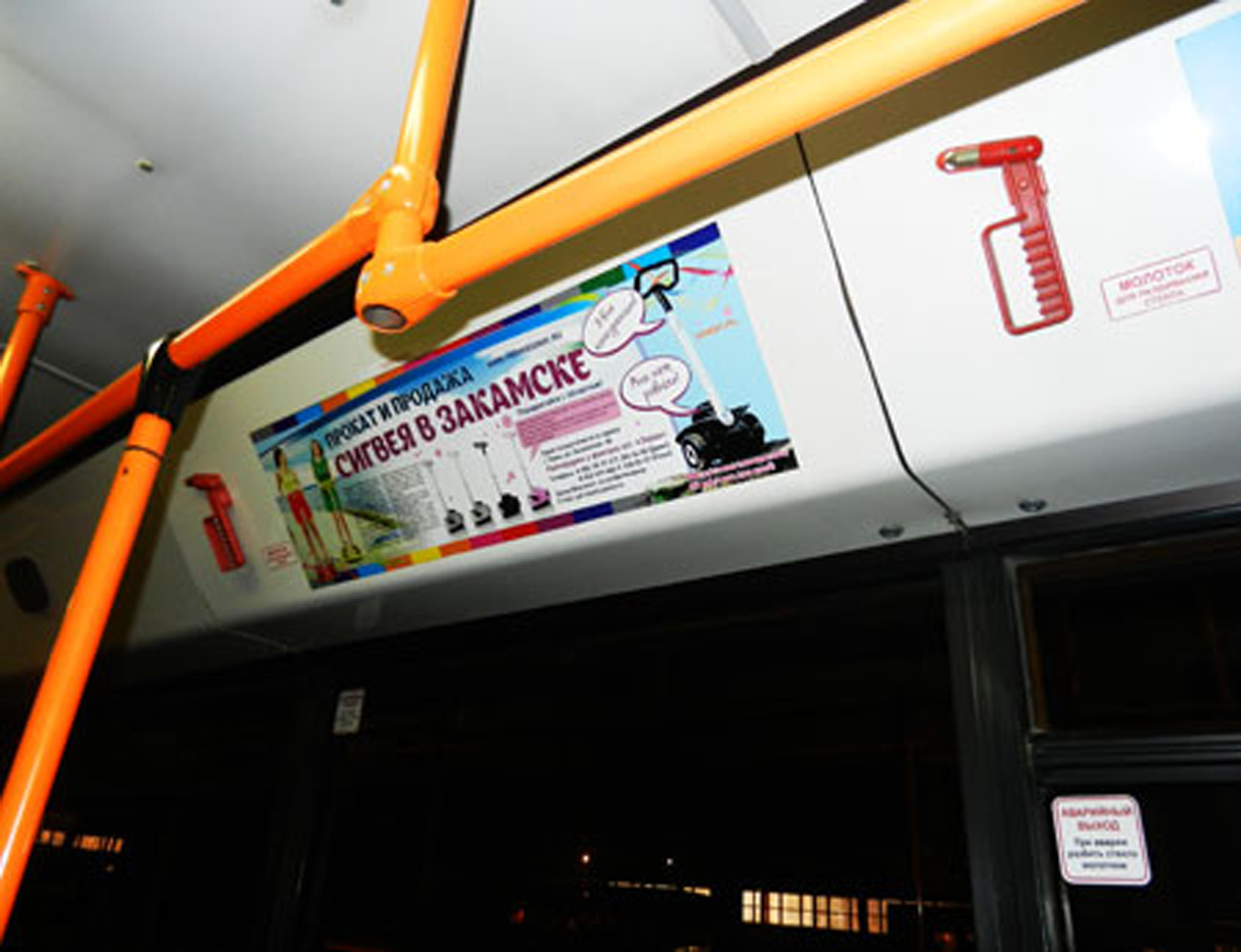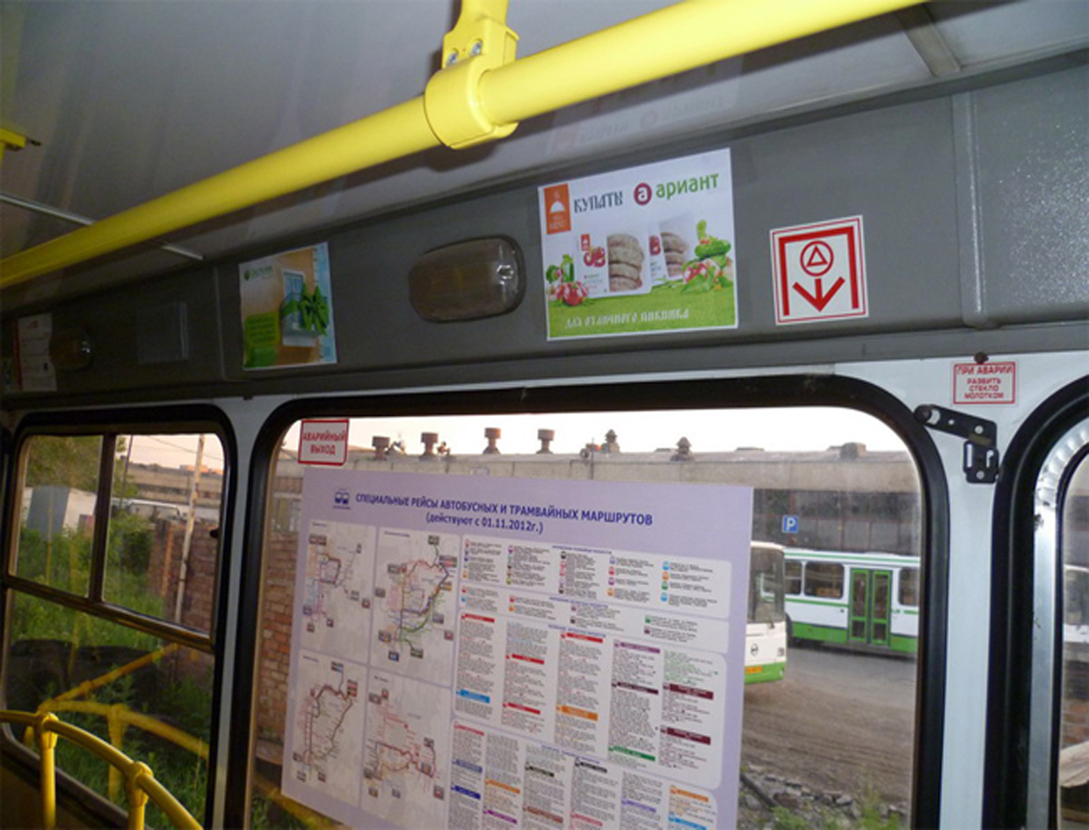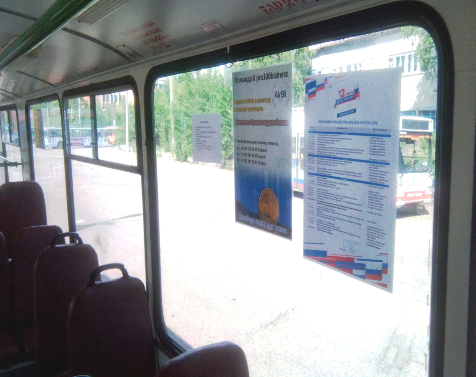 Монтаж рекламы в троллейбусах осуществляется по-разному в зависимости от того, какой рекламный материал и где размещается.