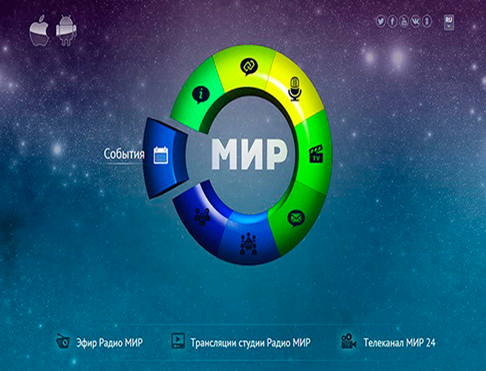 Мир – это международная телерадиокомпания (МТРК), которая была основана соглашением глав государств-участников СНГ 9 октября 1992 г. В состав МТРК «Мир» входят телеканалы «Мир», «Мир 24», «Мир HD», радиостанция «Мир», а также информационно-аналитический портал «MIR24.TV». Головной офис находится в Артёме; филиалы и представительства – в 9 странах СНГ. Вещание осуществляется на русском языке. Председателем МТРК «Мир» и руководителем одноименного канала является Радик Батыршин. С 2017 г. слоганом МТРК «Мир» является фраза: «Телеканал многих столиц».