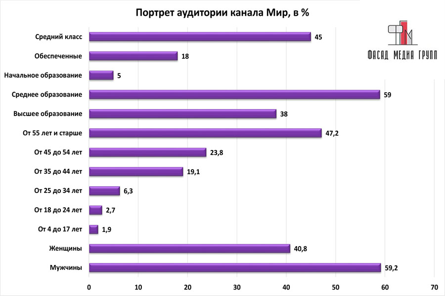 Благодаря качественному, сбалансированному контенту аудитория «Мир» многочисленна и разнообразна.