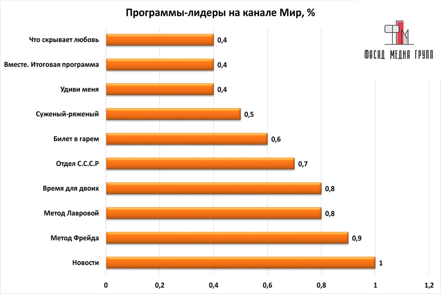 Популярность телеэфира на «Мир» приводит к ежегодному увеличению спроса на рекламное время. Для привлечения клиентов из разных регионов России, увеличения процента продаж, повышения имиджа компании и узнаваемости бренда – размещайте рекламу на «Мир». «Мир» – это проверенный и востребованный канал для размещения рекламы на артёмовском ТВ. Для размещения рекламы на телевидении обращайтесь в рекламное агентство «Фасад Медиа Групп». Будем рады сотрудничеству.