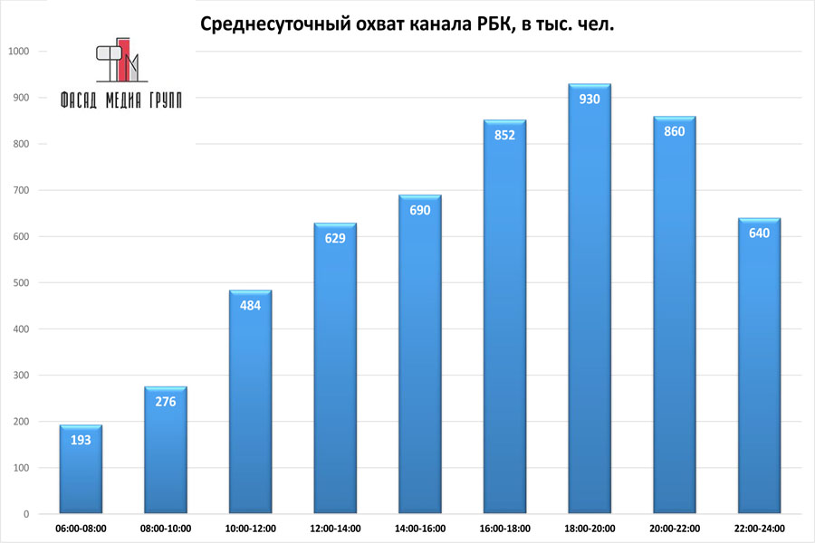 Популярность телеэфира на «РБК» приводит к ежегодному увеличению спроса на рекламное время. Для привлечения клиентов из разных регионов России, увеличения процента продаж, повышения имиджа компании и узнаваемости бренда – размещайте рекламу на «РБК». «РБК» – это проверенный и востребованный канал для размещения рекламы на артёмовском ТВ. Для размещения рекламы на телевидении обращайтесь в рекламное агентство «Фасад Медиа Групп». Будем рады сотрудничеству.