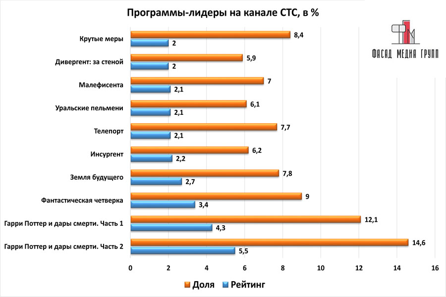Популярность телеэфира на «СТС» приводит к ежегодному увеличению спроса на рекламное время. Для привлечения клиентов из разных регионов России, увеличения процента продаж, повышения имиджа компании и узнаваемости бренда – размещайте рекламу на «СТС». «СТС» – это проверенный и востребованный канал для размещения рекламы на артёмовском ТВ. Для размещения рекламы на телевидении обращайтесь в рекламное агентство «Фасад Медиа Групп». Будем рады сотрудничеству.