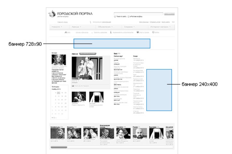 На сайте интернет-изданий (интернет-СМИ) размещаются баннеры различных размеров. Так, самыми распространенными являются следующие форматы: