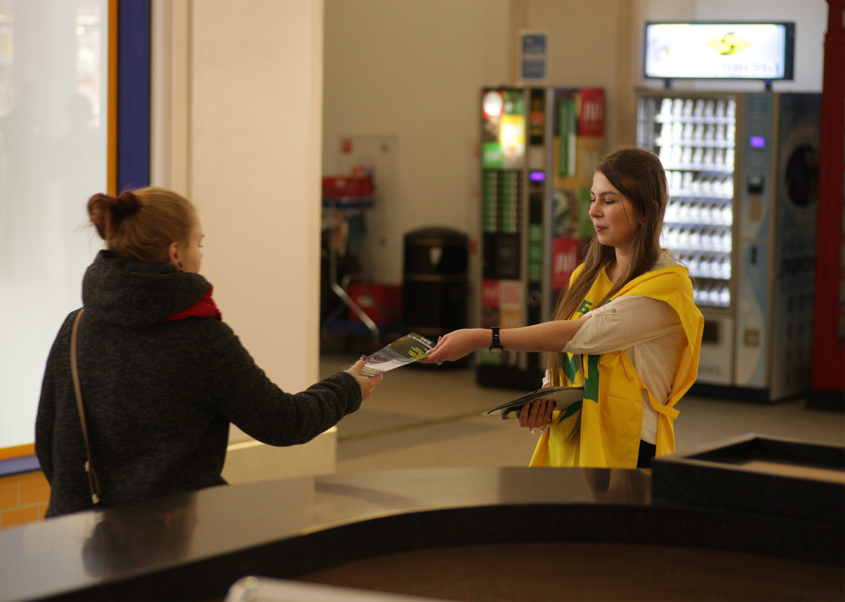 Пример рекламы в виде ростовой фигуры в бизнес-центрах: